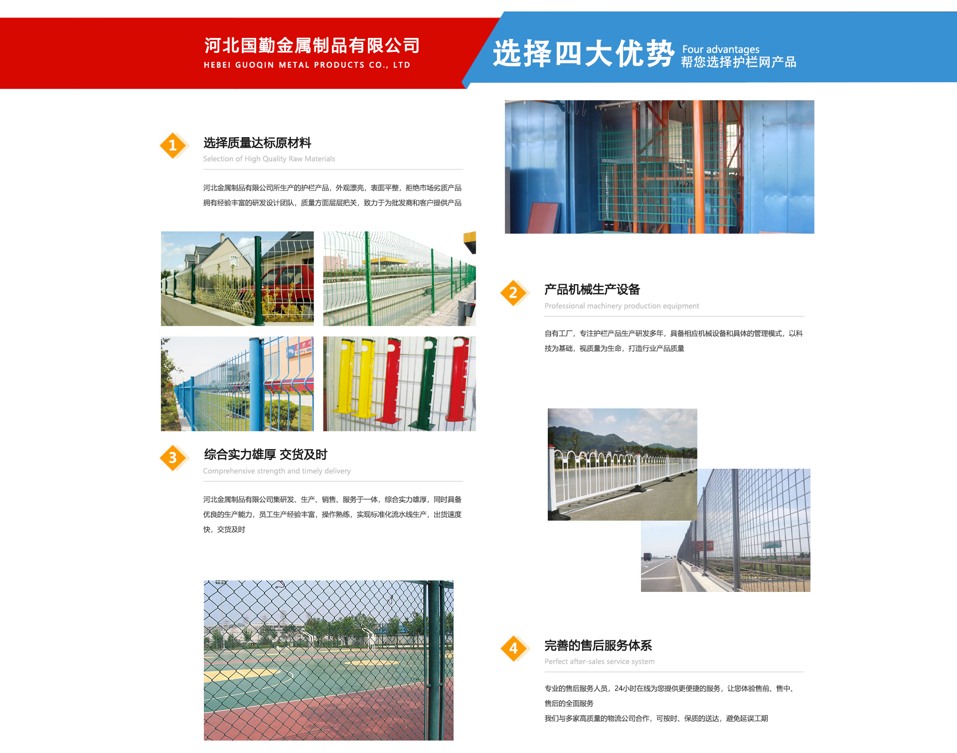 河北國勤金屬制品有限公司位于亞洲較大的絲網生產基地--享譽世界的“中國絲網之鄉”美譽的河北省安平縣境內。主要是以研發設計、制造生產、銷售服務于一體的高科技現代化企業。河北國勤金屬制品有限公司主營產品有護欄網,隔離網,市政工程,草坪護欄等各種系列產品的制造廠家。我廠產品被廣泛應用于公路、石化、化工、港口、合金、電力、造紙、鋼鐵、建材、市政、石油、污水處理及一般工業廠房、市政建設等各個領域。公司自成立以來一直為客戶提供優良,貼心的服務。從售前售中售后我們都以客戶為導向,以設計先進、高科技手段、價格低質量優等多方面為客戶提供整體全面的服務。我們相信科技創新的力量,本廠在產品技術基礎上不斷探索與創新,力求以更高品質的產品、更合理的價格、更完善的售后服務、不斷豐富的產品線滿足于每一位客戶的需求。